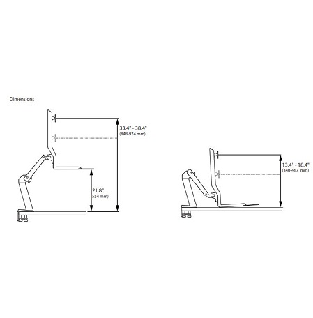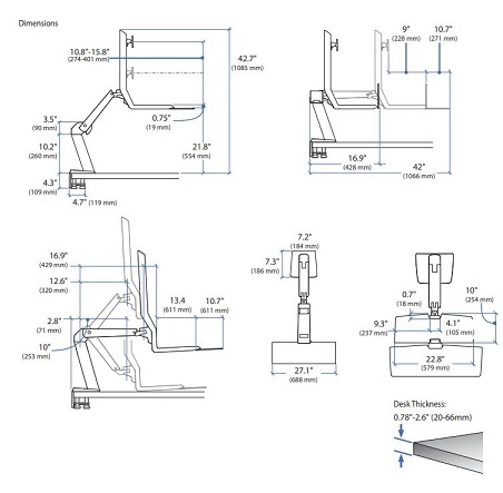 הזרוע נמשכת עד 42 אינץ' (107 ס"מ) מהגב של השולחן ונדחפת לאחור עד 18.25 אינץ' (46 ס"מ) כשהיא נסוגה