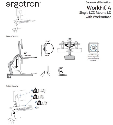 זרוע שולחנית הידראולית גז דו מפרקית ישיבה עמידה מסך מקלדת ועכבר ארגוטרון Ergotron 24-317-026 24 Inch WorkFit-A Single LD with Worksurface Sit-Stand Desk Arm Polished Aluminum