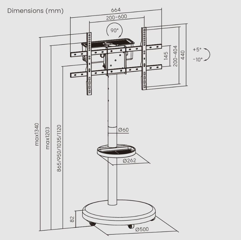 מעמד לטלוויזיה על גלגלים נסתרים למסכים החל מ- 37 אינץ' עד 86 אינץ' במשקל של עד 50 ק”ג.