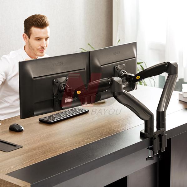 זרוע שולחנית הידראולית ישיבה עמידה דו מפרקית ארוכה לשני מסכי מחשב נצמד לשולחן (אפשרות הברגה) לגודל מסך עד 32'' עד משקל 9 ק''ג כולל האב רכזת NB North Bayou F195A Gas Strut Desktop Mount Hub USB3.0x2 Front