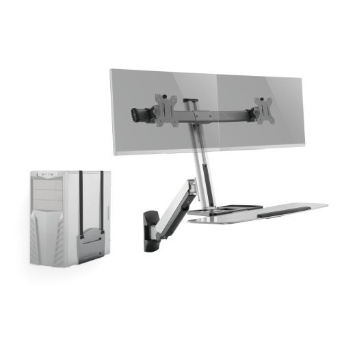 זרוע עמדת עבודה ישיבה עמידה לקיר לשני מסכי מחשב עד 32 אינץ' עד 6ק''ג מקלדת ועכבר כולל מתקן קיר למחשב נייח לומי Lumi DWS02-W02 DUAL SCREEN CLASSIC GAS SPRING COMPUTER WALL MOUNT WITH CPU HOLDER