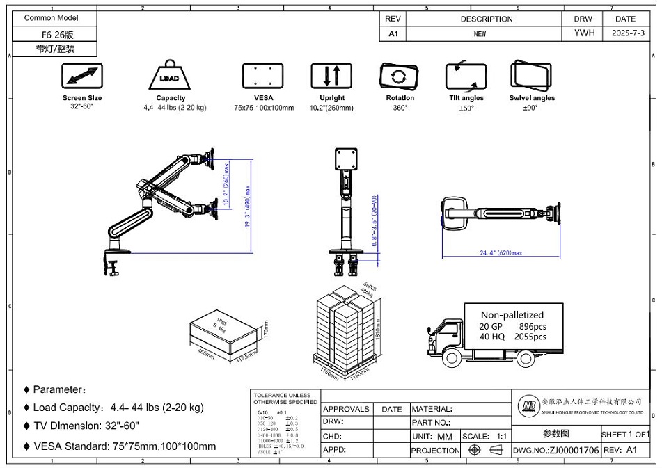 זרוע שולחנית דו מפרקית ארגונומית מיועדת למסך מחשב גדול במיוחד בגודל 32″ עד 60″ במשקל של עד 20 ק”ג.