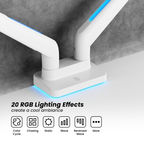 זרוע שולחנית הידראולית דו מפרקית לשני מסכים כבדים נצמד לשולחן (אפשרות הברגה) למסכים 17 אינץ' עד 35 אינץ' משקל נשיאה 20 קילו לכל מסך לבן כולל תאורה לומי Lumi LDT85-C024L Heavy-Duty RGB Gaming Monitor Arm For Dual Monitors 17-35 Inch 20kg White