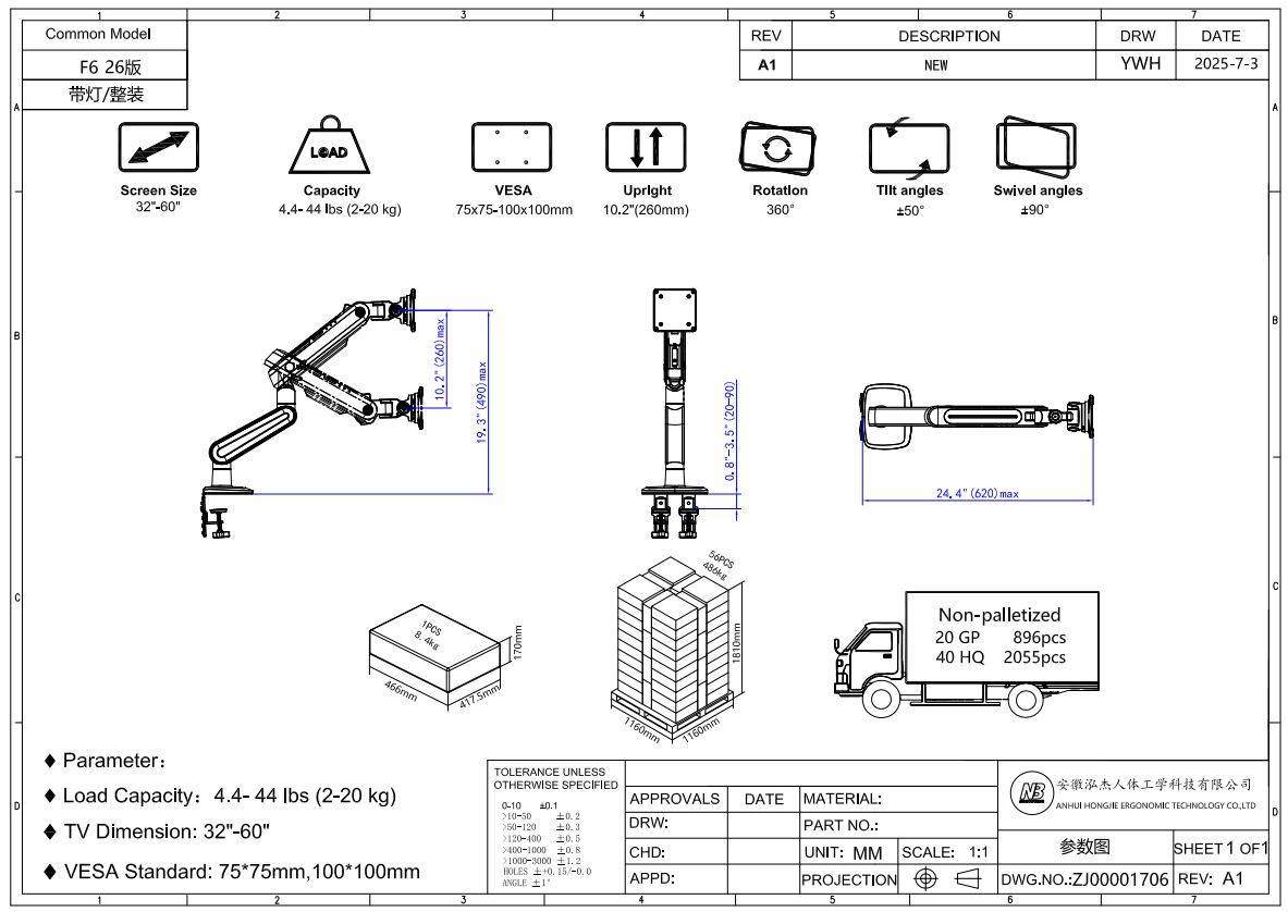 זוויות הטיה -50 עד +50 מעלות, זוויות סיבוב -90 עד +90 מעלות, הארכת זרוע מקסימלית עד 24.4 אינץ' (620).