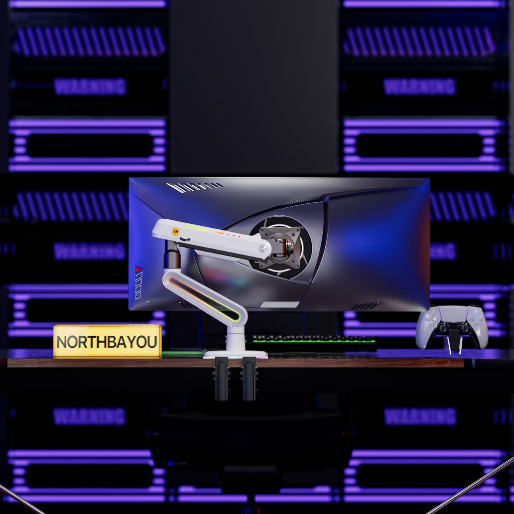 זרוע שולחנית דו מפרקית הידראולית למסכי גיימינג כולל תאורה ומסכים כבדים 32 עד 60 אינץ' משקל עד 20 קילו אורך מירבי 62 ס''מ גובה מירבי 49 ס''מ צבע לבן North Bayou NB E6 RGB Gaming Monitor Arm Hydraulic Double-Jointed Desktop Arm 32 Inches to 60 Inches Heavy Duty Weight up to 20kg White